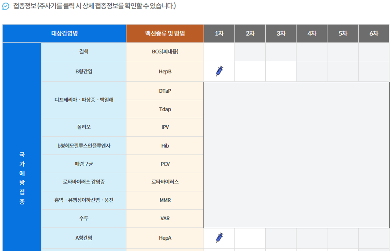 사이트에 들어가셔서 [예방접종관리 - 본인예방접종 내역조회]로 들어갑니다. 들어가 보시면, 대상감염병 별로 예방접종을 실시한 경우 주사기 모양이 표시되어 있습니다. 주사기 모양을 클릭하시면 상세 접종정보를 확인하실 수 있습니다.